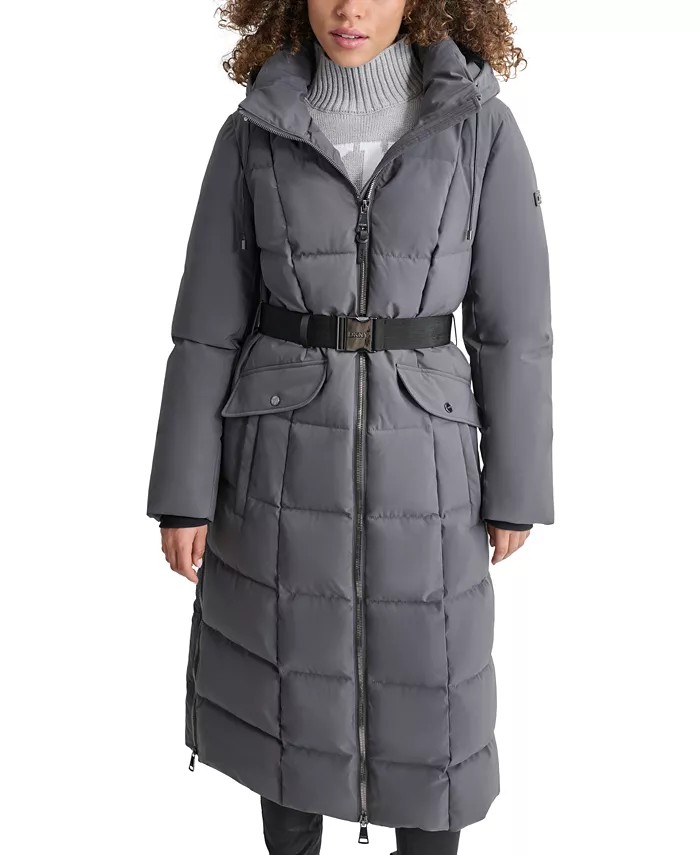 DKNY Women's Mixed-Media Belted Hooded Maxi Puffer Coat