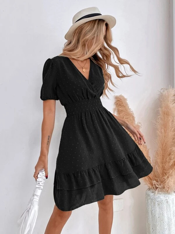 SEN Puff Sleeve Surplice Neck Shirred Waist Ruffle Hem Swiss Dot Dress