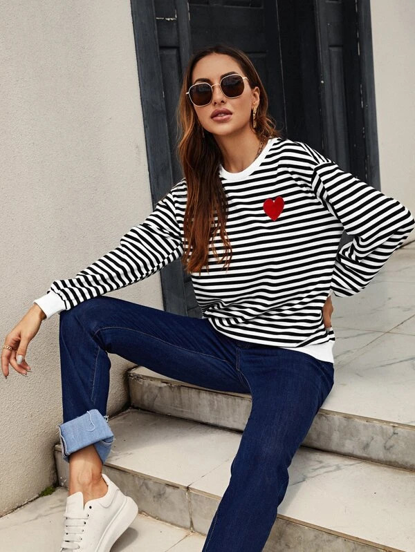 Shein Striped And Heart Patched Drop Shoulder Sweatshirt
