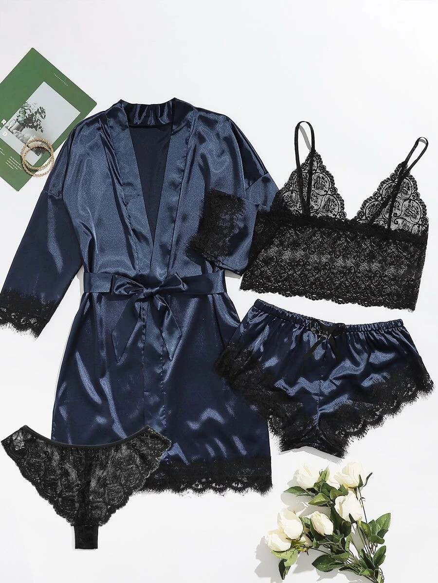 Shein 4pack Floral Lace Lingerie Set With Satin Belted Robe