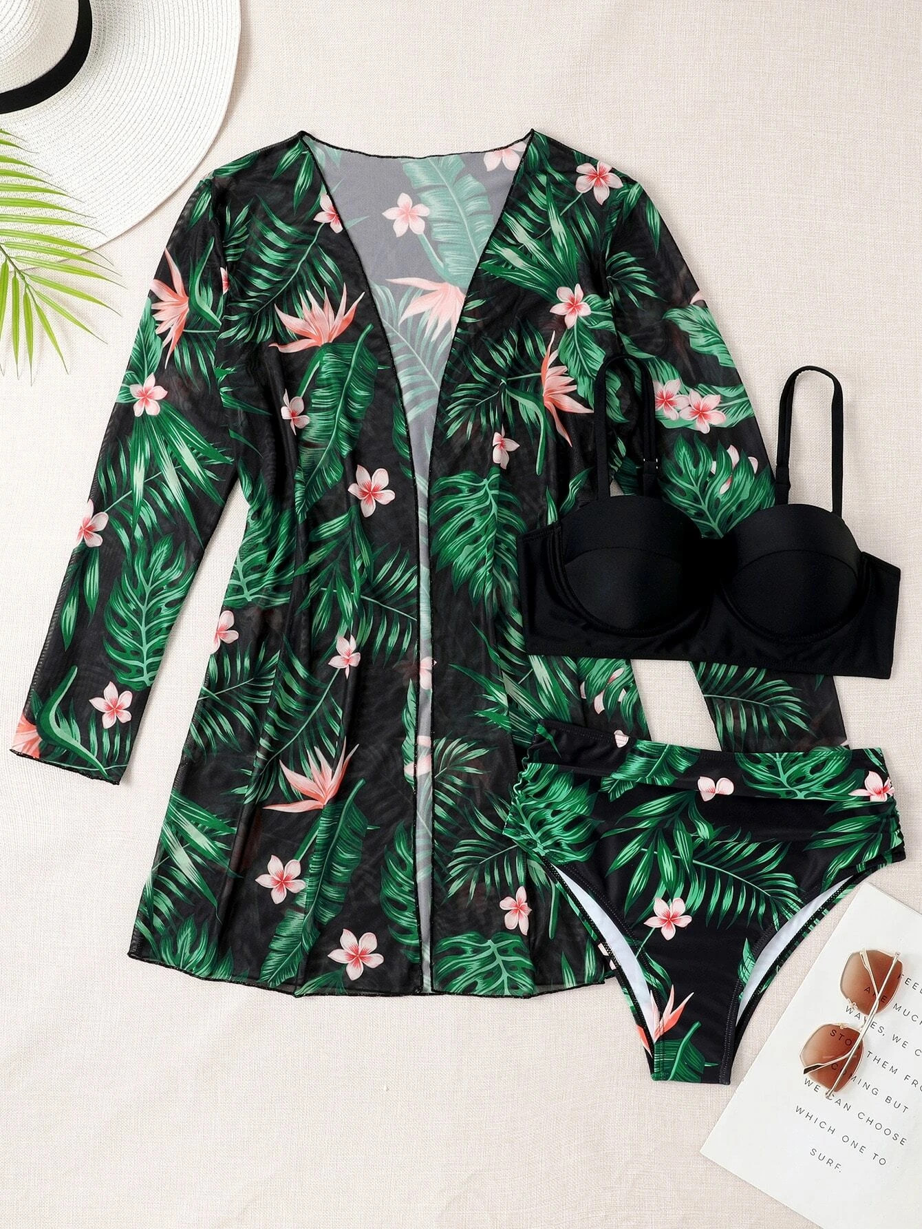 Shein Tropical Print Push Up Hipster Bikini Swimsuit & Kimono