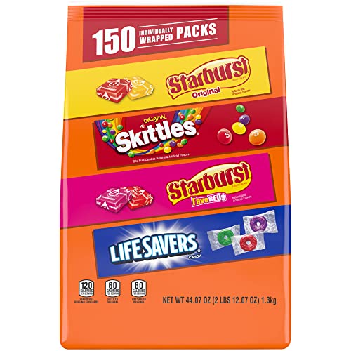 Fruity candy lovers, rejoice! Stock up on bulk candy treats with SKITTLES, STARBURST Original, STARBURST Fave Reds, and LIFE SAVERS Hard Candy. Each 150-piece fruity variety bag features 4 Fun Size candy favorites.