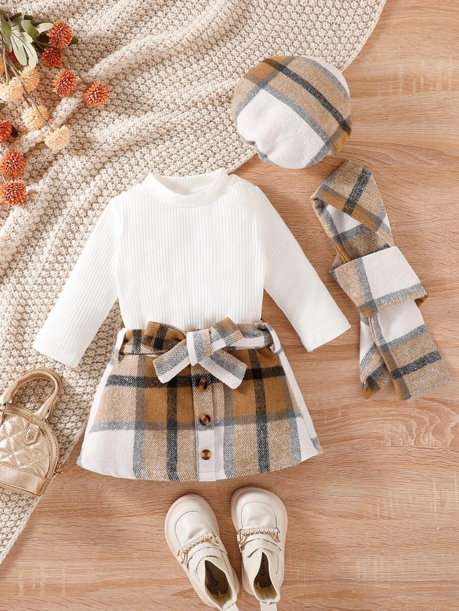 SEN Baby Rib-knit Bodysuit & Plaid Print Belted Skirt & Hat & Scarf